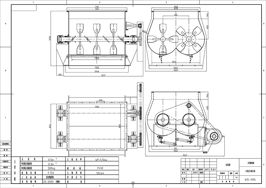无重力混合机装载着两根同时异向向外旋转的平行桨叶轴,每根轴上搭载十字桨叶,在驱动装置的同步作用下,两根的十字桨叶轴的运行轨迹成相交关系,且错位啮合。驱动装置驱使桨叶轴快速旋转,旋转的桨叶产生离心力,将物料有效抛洒至筒内上空部分,达到抛物线的highest点后下落(抛物线的highest点也称为瞬间无重力状态),物料再受桨叶的驱赶,在筒体内往复循环混合,并受双轴的啮合空间混合、剪切、分离,致使物料快速混合均匀。