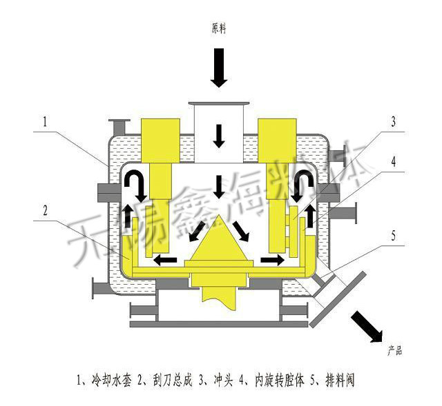 此设备主要是针对电池行业设备,上进料口(负极材料、导电剂、粘接剂、电解质)经机械融合及高精密混合处理,构成不同材料成分的分布,提高产品材料的利用率,构成不同材料的成分颗粒之间的复合化,降低产品的BET比面积,让产品颗粒以高密度填充;将纳米级粉末包覆在微米级的颗粒上,从而改进粉体的许多物理,化学特性。机械融合设备就是基于此原理开发的。物料在转子中高速旋转,在离心力的作用下紧贴器壁,在转子和定子挤压头之间高速穿过。在这个瞬间,物料同时受到挤压力和剪切力的作用,由于高速旋转,物料在转子和定子之间循环往复,不断地受到挤压力和剪切力的作用,在摩擦力的作用下颗粒表面达到一种机械熔融状态,从而将纳米级的超细粉末包覆在微米级的颗粒上。